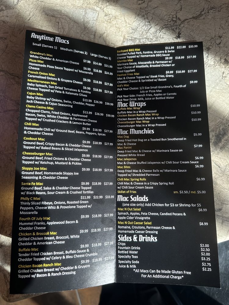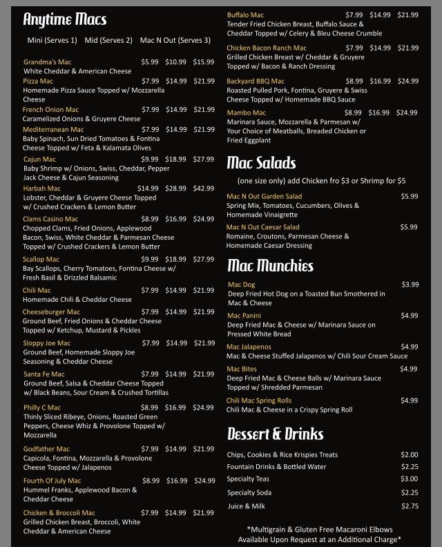 Mac N' Out Macaroni & Cheese Menu